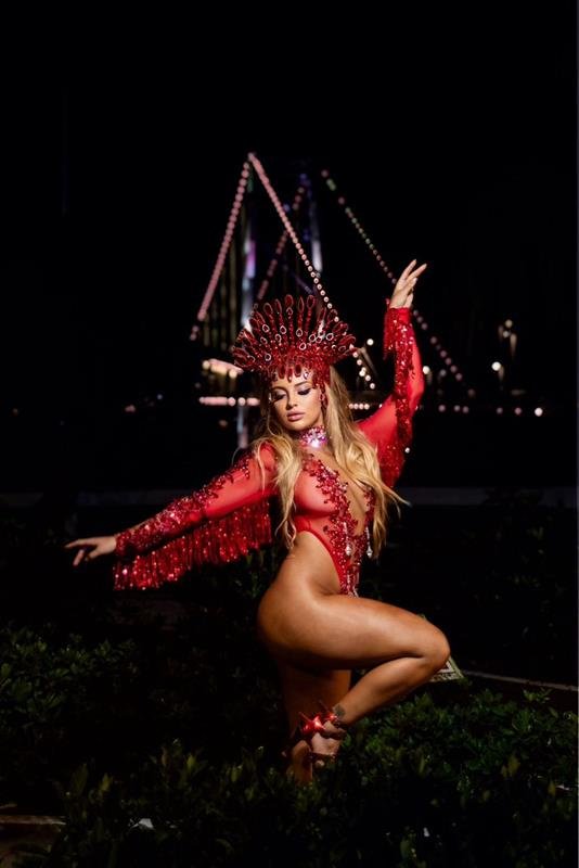 Para o ensaio técnico, Sarah surgiu com figurino assinado pelo Ateliê da estilista Eunice Fernandes, desenvolvido especialmente para valorizar a identidade da escola e a força estética do desfile. A fantasia reúne riqueza de detalhes, acabamento artesanal e uma leitura contemporânea do Carnaval, antecipando o impacto visual que a Consulado pretende levar para a avenida.